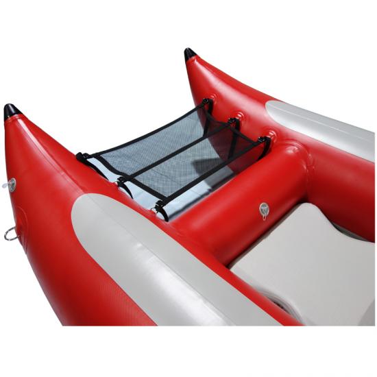 This innovative cataraft features a frameless design, comprising two inflatable pontoons separated by two perpendicular thwarts. With a ground-to-thwart distance of slightly over 2 feet, ample space is provided for thrilling excursions on most Class IV rivers. A heavy-duty, wide rub strake safeguards the bottom of the tubes from potential damage caused by sharp rocks, ensuring durability and longevity.